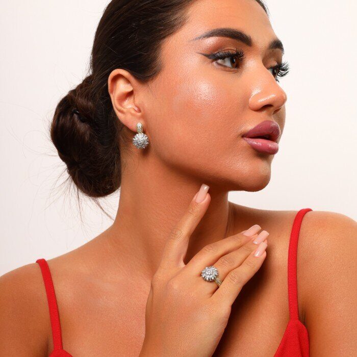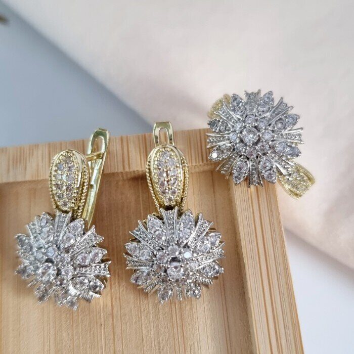 Комплект ювелирной бижутерии Итальянское золото (покрытие желтое 14к), серьги и кольцо, вставка: фианиты, р-р 18, арт.216.060-18