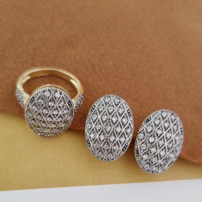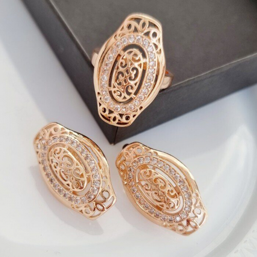 Комплект ювелирной бижутерии Итальянское золото (покрытие желтое 14к), серьги и кольцо, вставка: фианиты, р-р 18,Уценка, арт. 08.1368