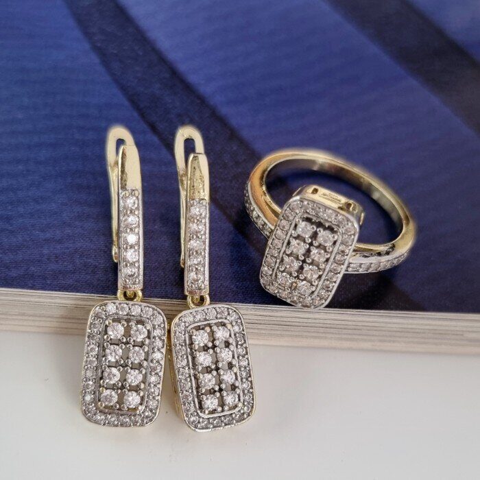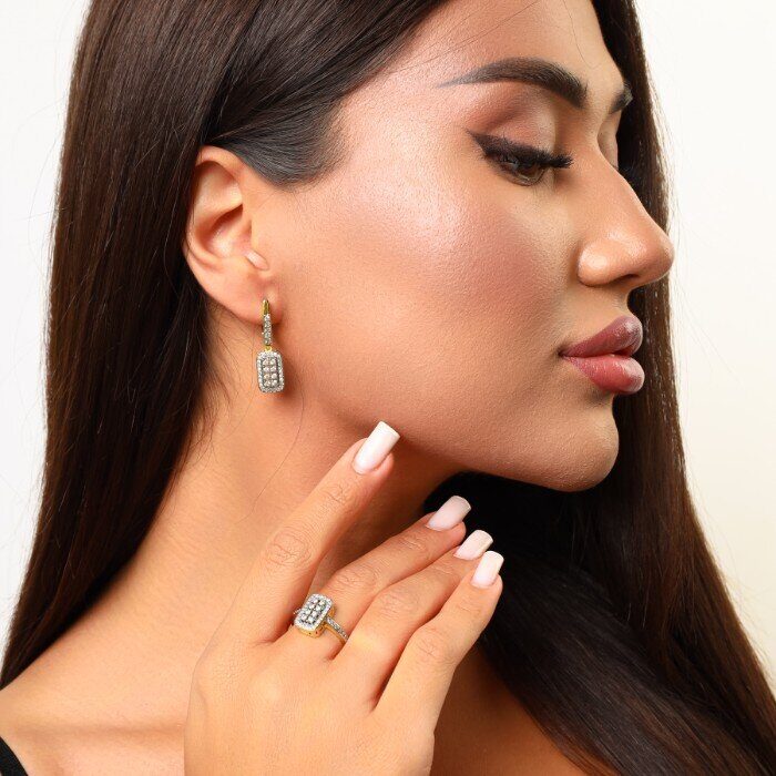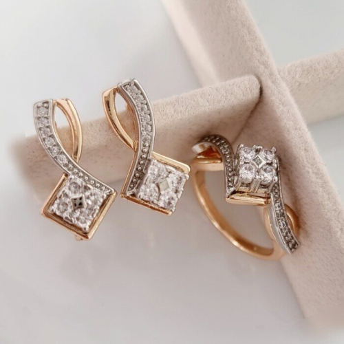 Комплект ювелирной бижутерии Итальянское золото (покрытие желтое 14к), серьги и кольцо, вставка: фианиты, р-р 19, Уценка, арт. 08.1394