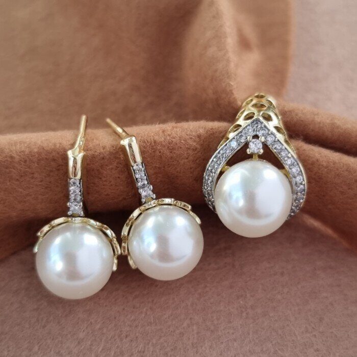 Комплект ювелирной бижутерии Итальянское золото (покрытие желтое 14к), серьги и кольцо, вставка: фианиты и жемчуг искусственный, р-р 18,5, арт. 216.055-18,5