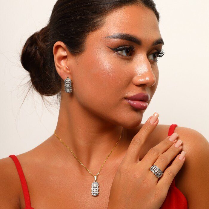 Описание Размер серьги: 2,6*1 см. Замок: английский. Размер кулона: 3,5*1 см. Вес комплекта: 15 гр. Внимание! Цепочка в комплект не входит!