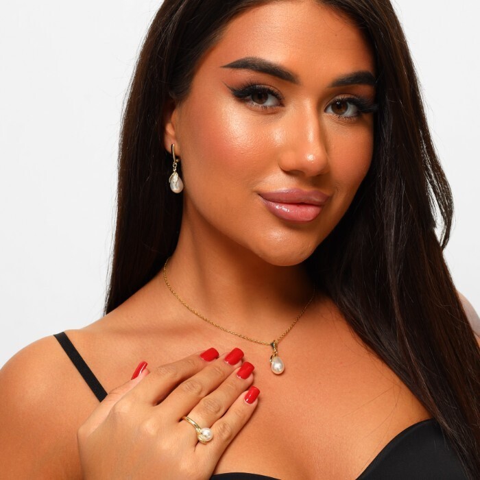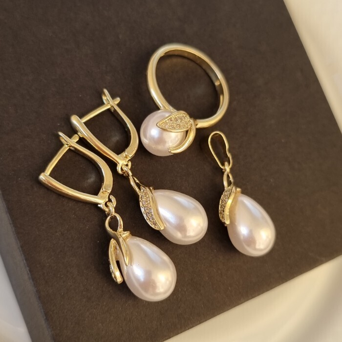 Комплект ювелирной бижутерии Итальянское золото (покрытие желтое 14к), серьги и кольцо, вставка: фианиты и искусственный жемчуг, 18 р, Уценка, арт.08.1876