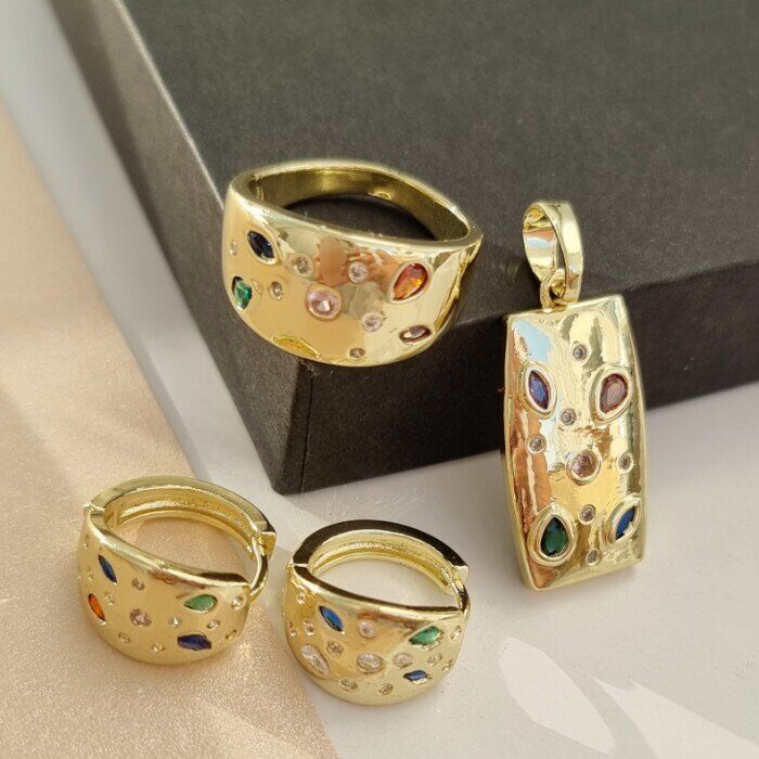 Рейтинги товара «Комплект ювелирной бижутерии Итальянское золото (покрытие желтое 14к), серьги конго, кулон и кольцо 19 р, покрытие позолота, вставка: фианиты, цвет: красный, розовый,зеленый, арт.213.056-19»