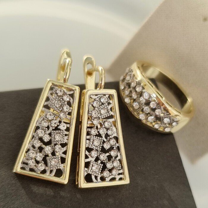 Комплект ювелирной бижутерии Итальянское золото (покрытие желтое 14к), серьги крупные и кольцо 17 р, двойное покрытие позолота и поверебрение, вставка: фианиты, цвет: прозрачный, арт.213.061-17