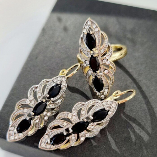 Комплект ювелирной бижутерии Итальянское золото (покрытие желтое 14к), серьги крупные и кольцо 19 р, покрытие позолота и посеребрение, вставка: фианиты, цвет: прозрачный и черный, арт.213.055-19