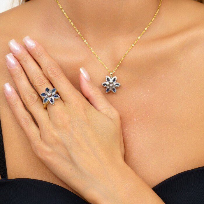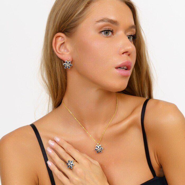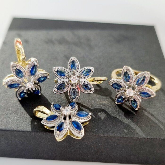 Комплект ювелирной бижутерии Итальянское золото (покрытие желтое 14к), серьги крупные, кулон и кольцо 18 р, покрытие позолота и посеребрение, вставка: фианиты, цвет: прозрачный и синий, арт. 213.046-1
