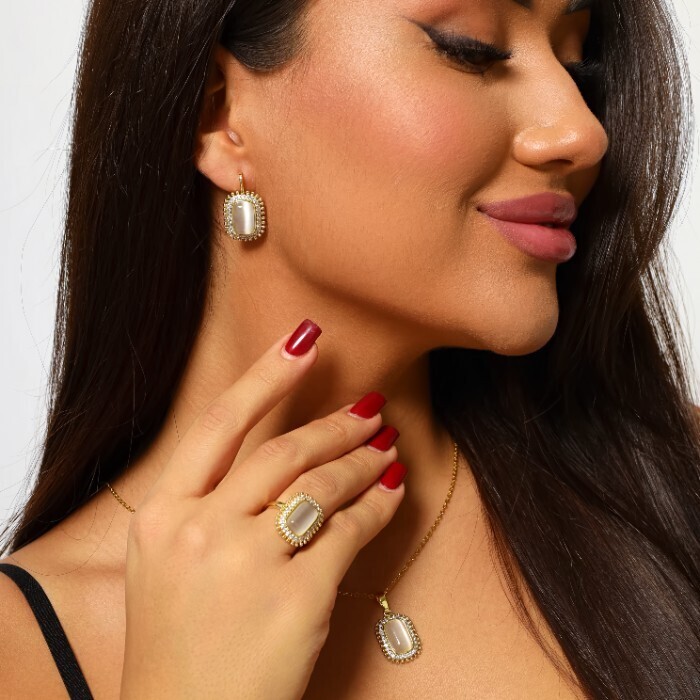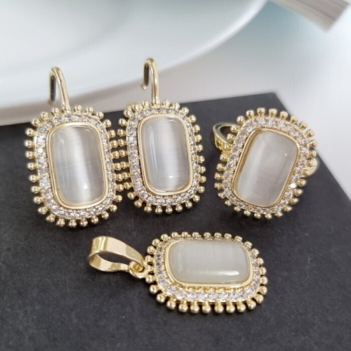 Комплект ювелирной бижутерии Итальянское золото (покрытие желтое 14к) серьги крупные, кулон и кольцо 19 р, покрытие позолота, вставка: фианиты и камень кошачий глаз, цвет:прозрачный Уценка,арт.08.2148