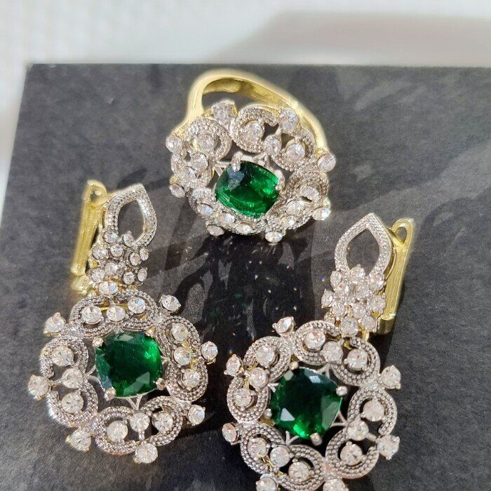 Комплект ювелирной бижутерии Итальянское золото (покрытие желтое 14к), серьги висячие и кольцо 18,5, покрытие позолота и посеребрение, вставка: фианиты, цвет: прозрачный и зеленый, арт. 213.039-18,5