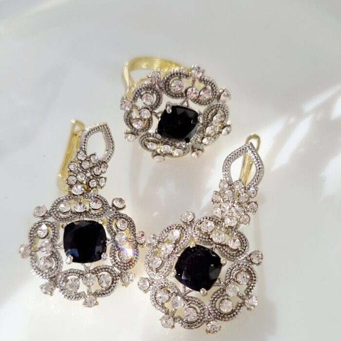 Комплект ювелирной бижутерии Итальянское золото (покрытие желтое 14к), серьги висячие и кольцо 18 р, покрытие позолота и посеребрение, вставка: фианиты, цвет: прозрачный и черный, арт. 213.044-18