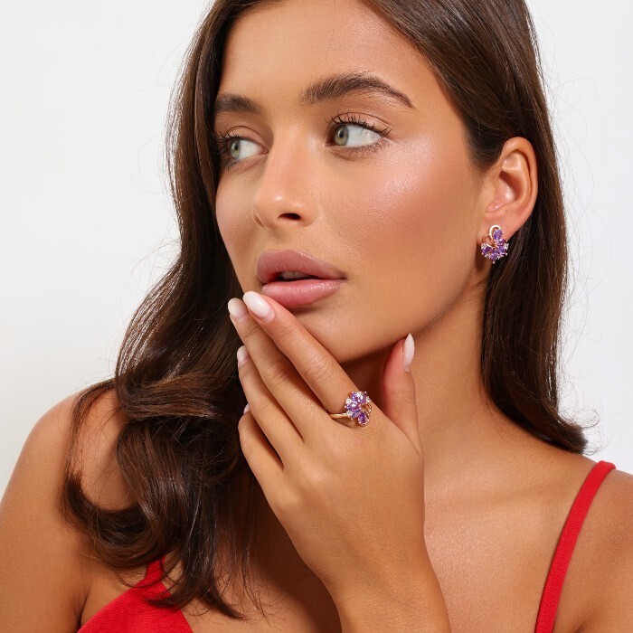 Комплект ювелирной бижутерии коллекция "Дубай" серьги и кольцо 16 р, покрытие позолота, вставка: фианиты, цвет: фиолетовый и прозрачный, арт.215.483-16