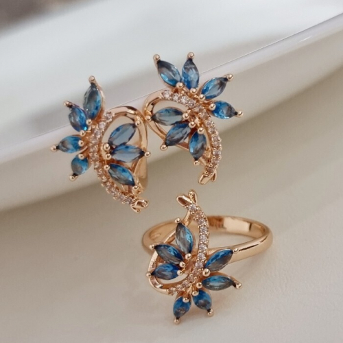 Комплект ювелирной бижутерии коллекция "Дубай" серьги и кольцо 16 р, покрытие позолота, вставка: фианиты, цвет: голубой и прозрачный, арт.215.489-16