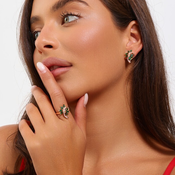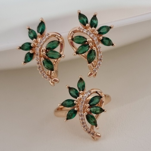 Комплект ювелирной бижутерии коллекция "Дубай" серьги и кольцо 16 р, покрытие позолота, вставка: фианиты, цвет: зеленый и прозрачный, арт.215.490-16
