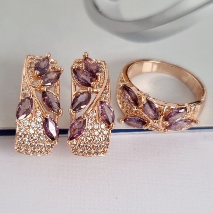 Комплект ювелирной бижутерии коллекция "Дубай" серьги и кольцо 17 р, покрытие позолота, вставка: фианиты, цвет: фиолетовый и прозрачный, Уценка, арт.08.2271