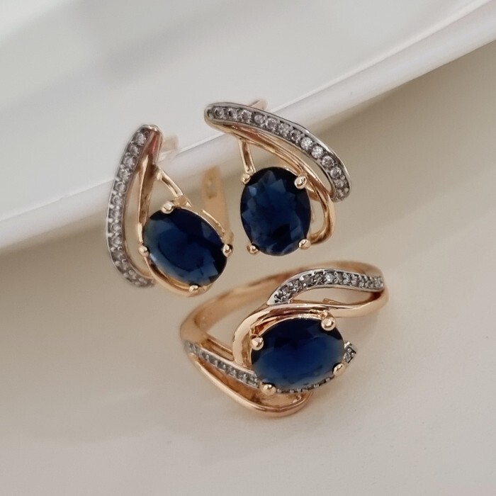 Комплект ювелирной бижутерии коллекция "Дубай" серьги и кольцо 17 р, покрытие позолота, вставка: фианиты, цвет: синий и прозрачный, арт.215.473-17