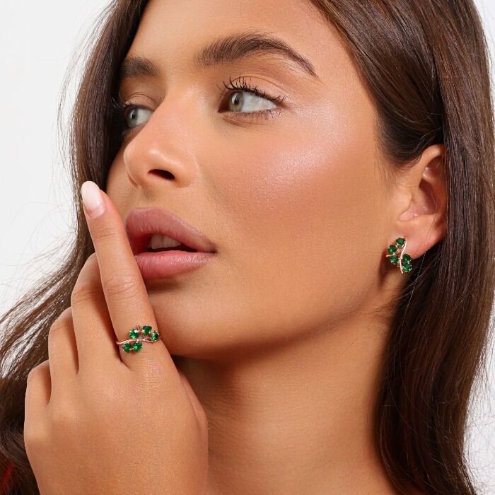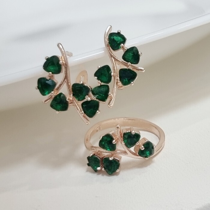 Комплект ювелирной бижутерии коллекция "Дубай" серьги и кольцо 17 р, покрытие позолота, вставка: фианиты, цвет: зеленый, арт.215.496-17
