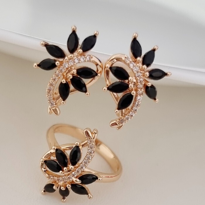 Комплект ювелирной бижутерии коллекция "Дубай" серьги и кольцо 18 р, покрытие позолота, вставка: фианиты, цвет: черный и прозрачный, арт.215.486-18