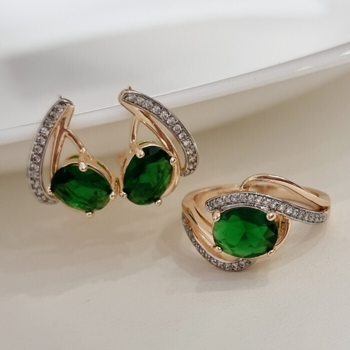 Комплект ювелирной бижутерии коллекция "Дубай" серьги и кольцо 20 р, покрытие позолота, вставка: фианиты, цвет: зеленый и прозрачный, арт.215.475-20