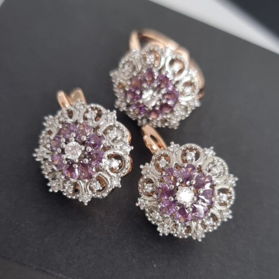 Комплект ювелирной бижутерии коллекция "Дубай" серьги и кольцо, двойное покрытие: позолота и посеребрение, вставка: фианиты, цвет: прозрачный и сиреневый, р-р 18,Уценка, арт.08.1493