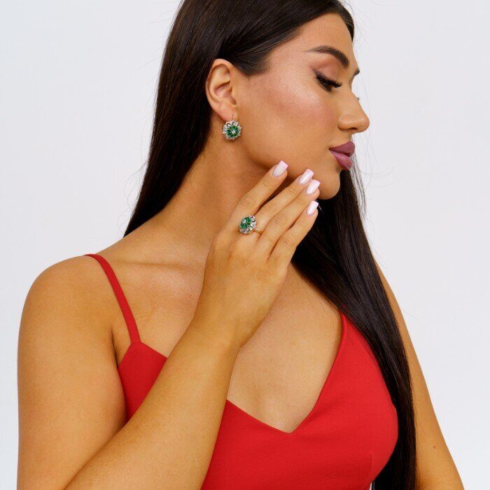 Комплект ювелирной бижутерии коллекция "Дубай" серьги и кольцо, двойное покрытие: позолота и посеребрение, вставка: фианиты, цвет: прозрачный и изумрудный, р-р 19, Уценка, арт.08.2171