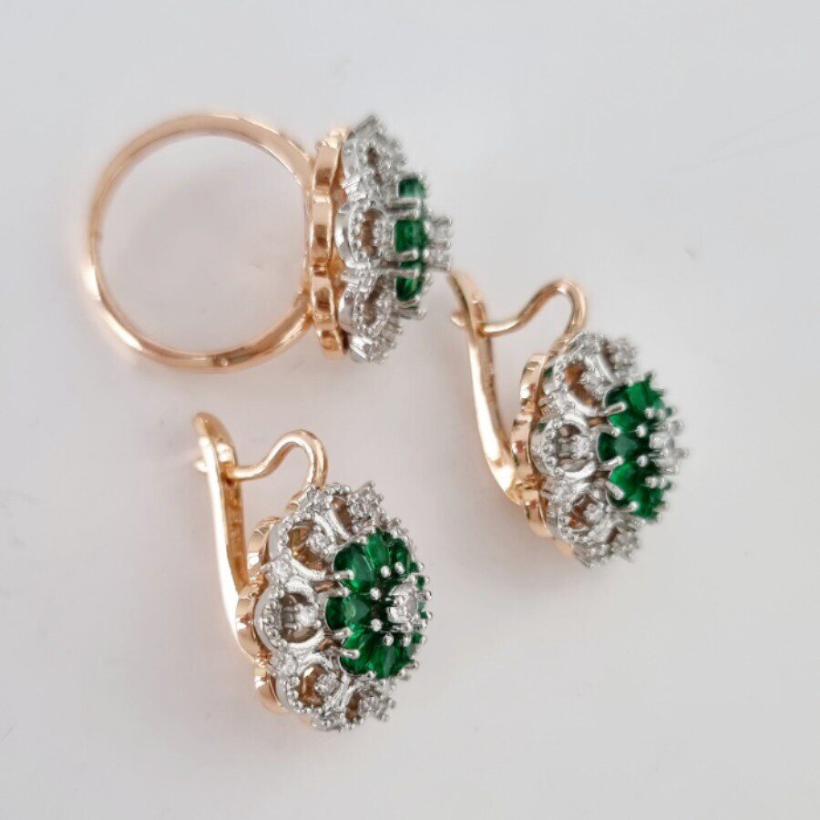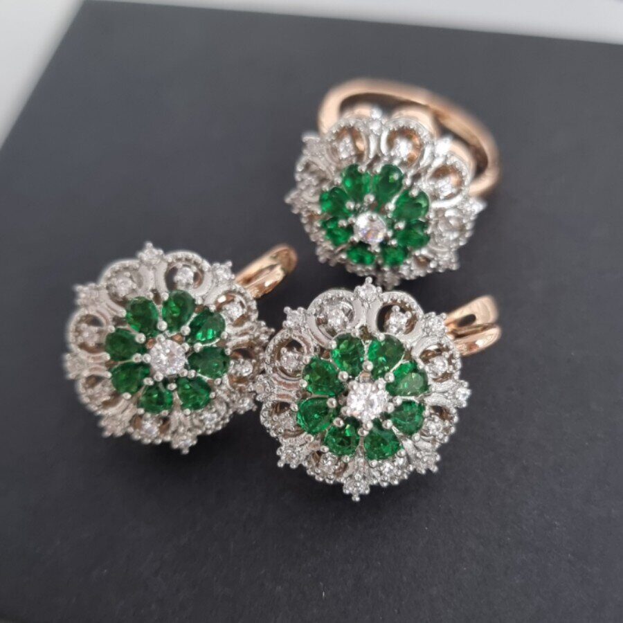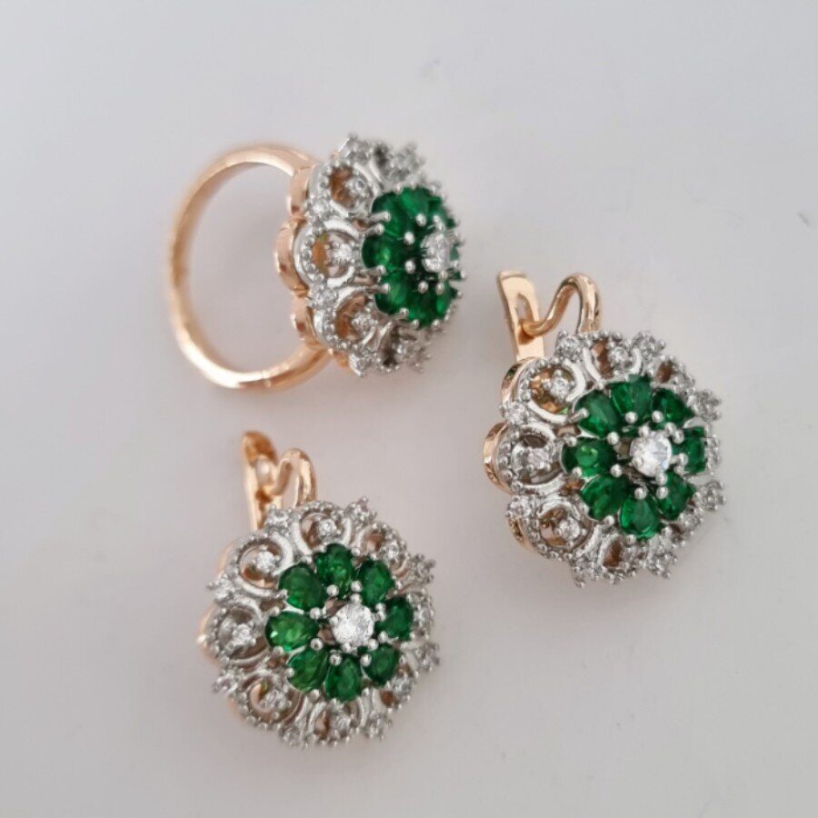 Описание Уценка! Нет одного зеленого камня в каждой серьге и кольце. Размер кольца: 19 р, размер серьги: 2,5*1,9 см. Замок: английский. Вес комплекта: 22 гр.