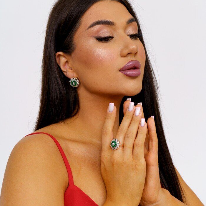 Комплект ювелирной бижутерии коллекция "Дубай" серьги и кольцо, двойное покрытие: позолота и посеребрение, вставка: фианиты, цвет: прозрачный и изумрудный, р-р 18, Уценка, арт.08.2189
