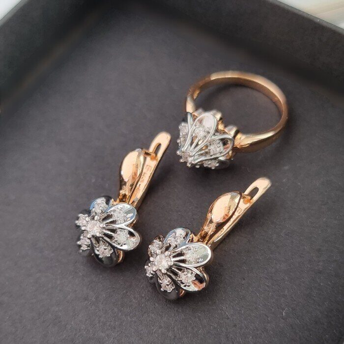 Комплект ювелирной бижутерии коллекция "Дубай" серьги и кольцо, двойное покрытие: позолота и посеребрение, вставка: фианиты, цвет: прозрачный, р.р-18, Уценка, арт.08.1738