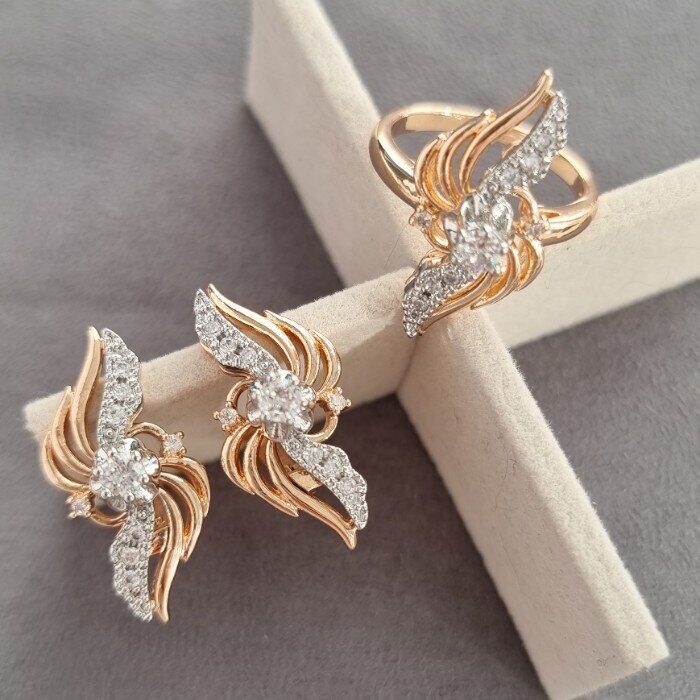 Комплект ювелирной бижутерии коллекция "Дубай" серьги и кольцо, двойное покрытие: позолота и посеребрение, вставка: фианиты, цвет: прозрачный, р.р-19, Уценка, арт.08.1804