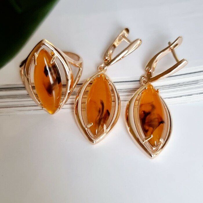 Описание Уценка! Небольшие вмятинки на поверхноси, царапинки.Размер кольца: 19. Размер серёжек: 4,7*1,5 см. Замок: английский. Материал: бижутерный сплав, янтарь. Вес: 13 гр.
