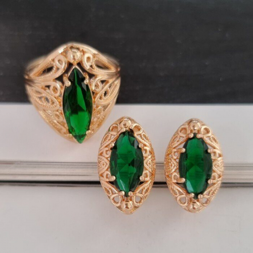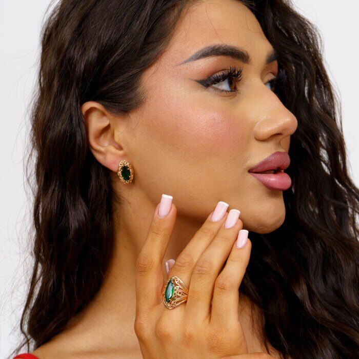 Комплект ювелирной бижутерии коллекция "Дубай" серьги и кольцо, покрытие: позолота, вставка: камень, цвет: зеленый, р-р 19, 064,Уценка, арт.08.1299