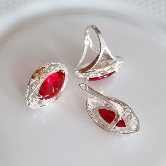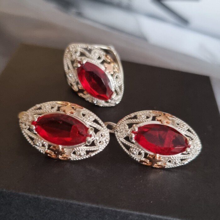 Комплект ювелирной бижутерии коллекция "Дубай",серьги и кольцо покрытие серебрение, вставка: камень красный, р-р 18, 09809, Уценка, арт.08.1403