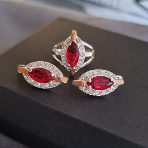 Описание Размер кольца: 17. Размер серёжек: 2,3*1,2 см. Замок: английский. Материал: бижутерный сплав, камни. Вес: 9 гр.