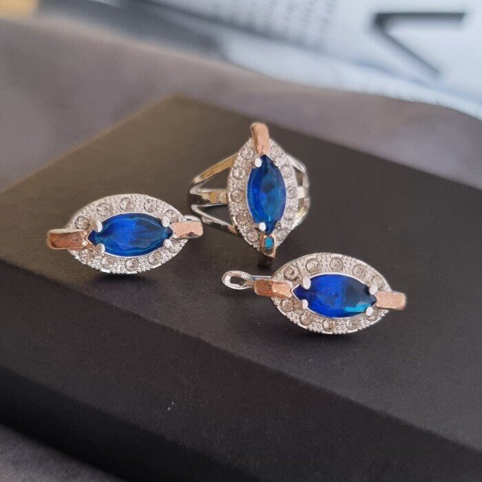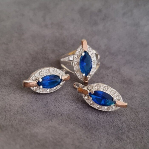 Описание Размер кольца: 17,5. Размер серёжек: 2,3*1,2 см. Замок: английский. Материал: бижутерный сплав, камни. Вес: 9 гр.
