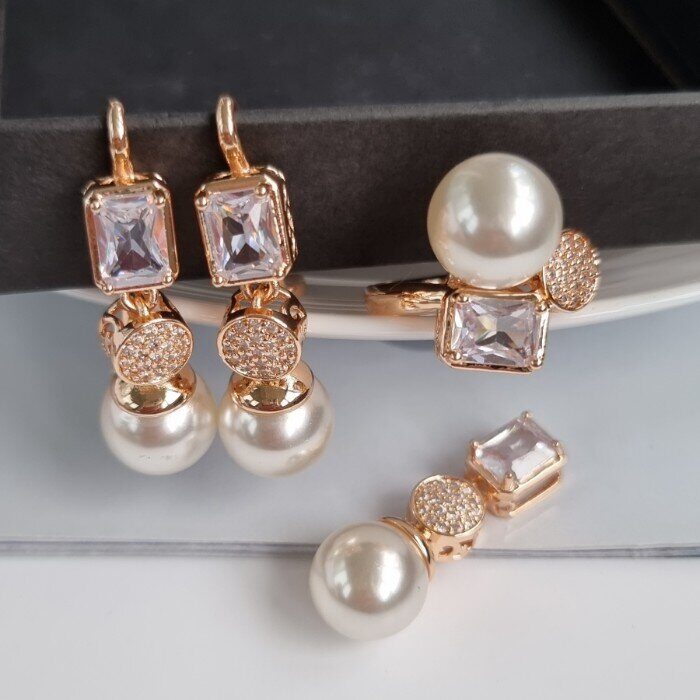 Описание Уценка! В кольце нет жемчужины, Жемчужины на серьгах с небольшими шероховатостями.Размер серьги: 3,8*1,2 см. Размер кулона: 3,2*1,2. Замок: английский. Вес комплекта: 18 гр.
