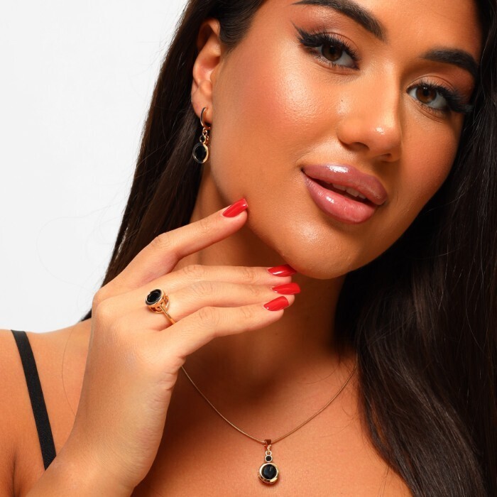 Комплект ювелирной бижутерии коллекция "Дубай" серьги, кольцо и кулон покрытие позолота, вставка: крупный фианит, цвет: черный, 17 р,Уценка, арт.08.1899
