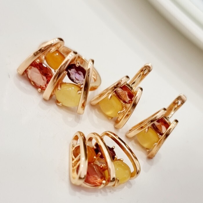 Комплект ювелирной бижутерии коллекция "Дубай" серьги, кулон и кольцо 17 р покрытие позолота, вставка: фианиты, цвет: разноцветный, Уценка, арт.08.2231