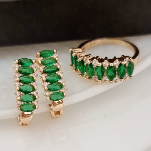 Описание Уценка! Нет одного зеленого камня в кольце. Размер серьги: 1,1*0,5 см. Замок: английский. Вес комплекта: 7 гр.