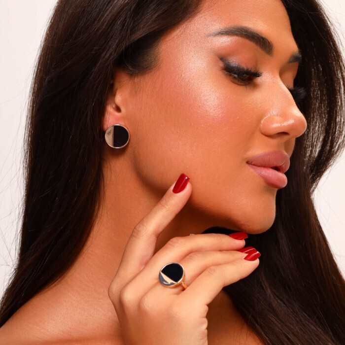 Комплект ювелирной бижутерии коллекция "Дубай" в форме кругов серьги и кольцо 19 р, покрытие: позолота, вставка: искусственный камень, цвет: черный,Уценка, арт.08.2066
