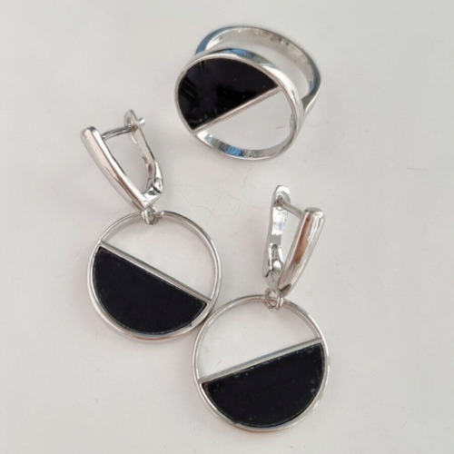 Комплект ювелирной бижутерии, посеребрение: серьги и кольцо с черной вставкой (сверху на камне наклеена пленка), р-р 20,5, 13085, арт.213.011-20,5