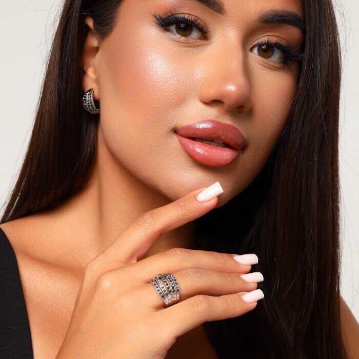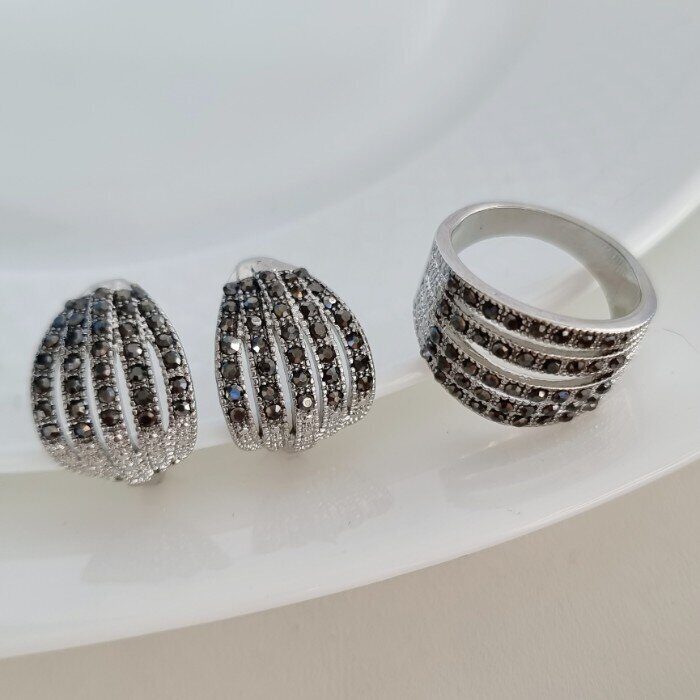 Комплект ювелирной бижутерии, посеребрение: серьги и кольцо с фианитами, р-р 18, арт.213.013-18