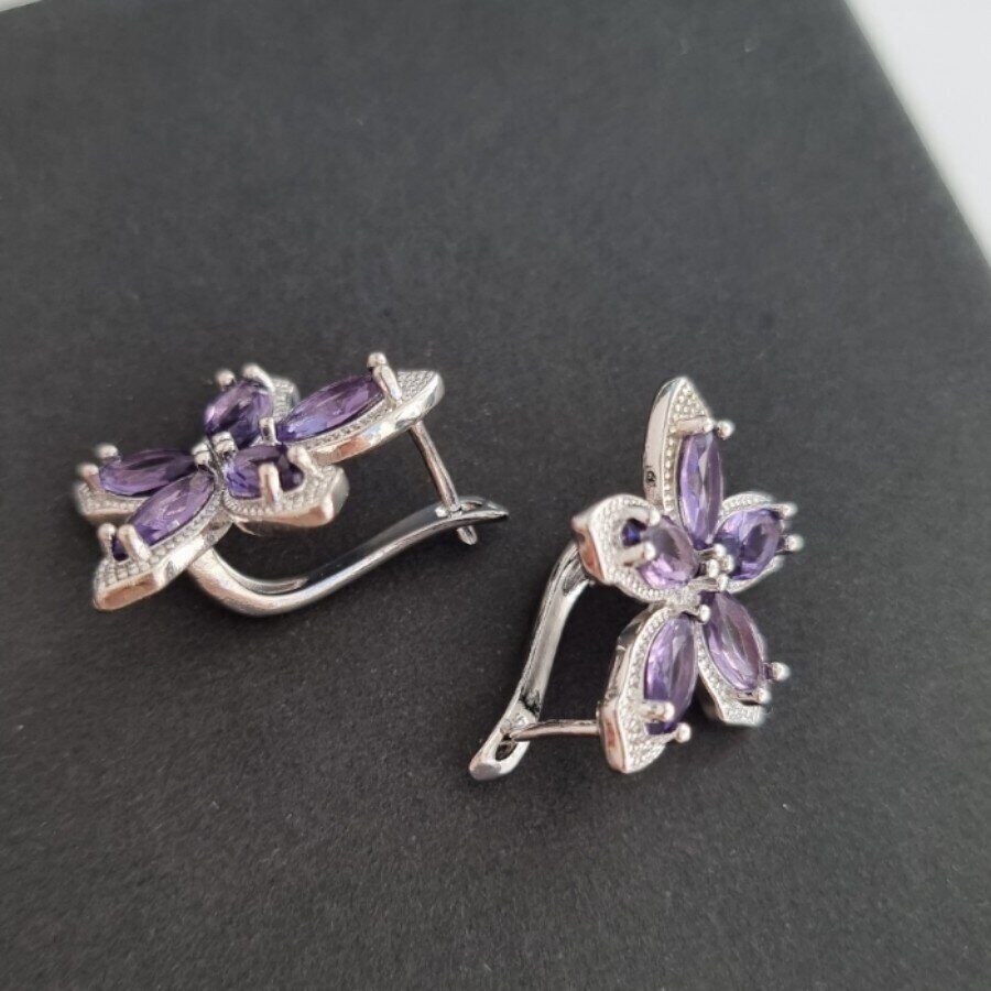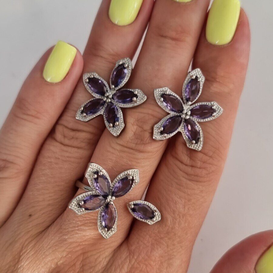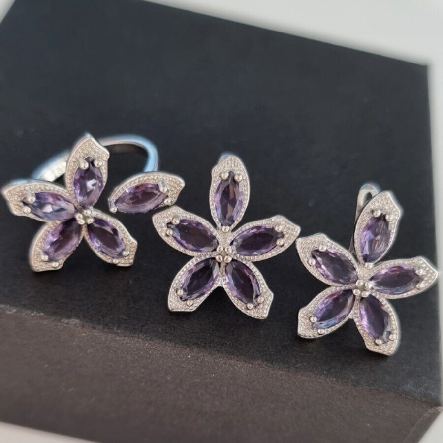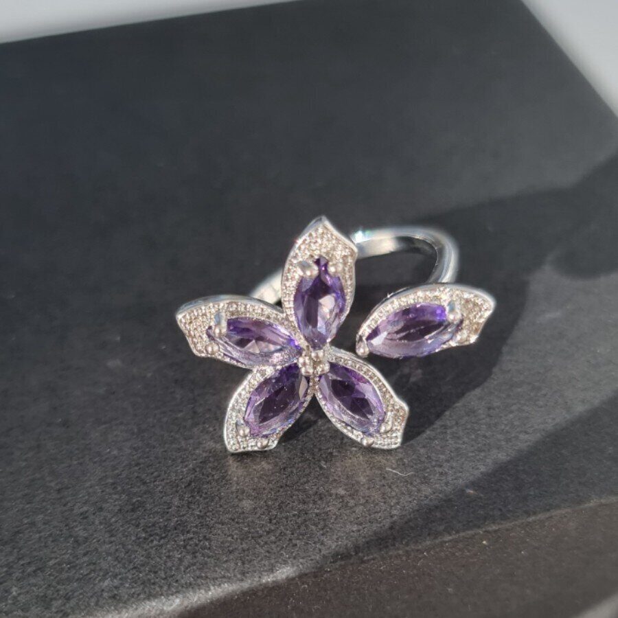 Комплект ювелирной бижутерии, посеребрение: серьги и раздвижное кольцо с фиолетовыми камнями, р-р от 16-19, 13098, арт.213.009