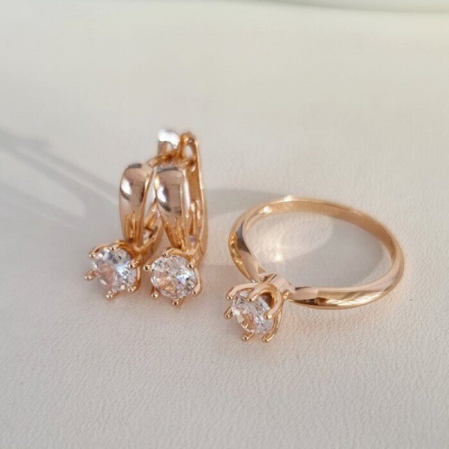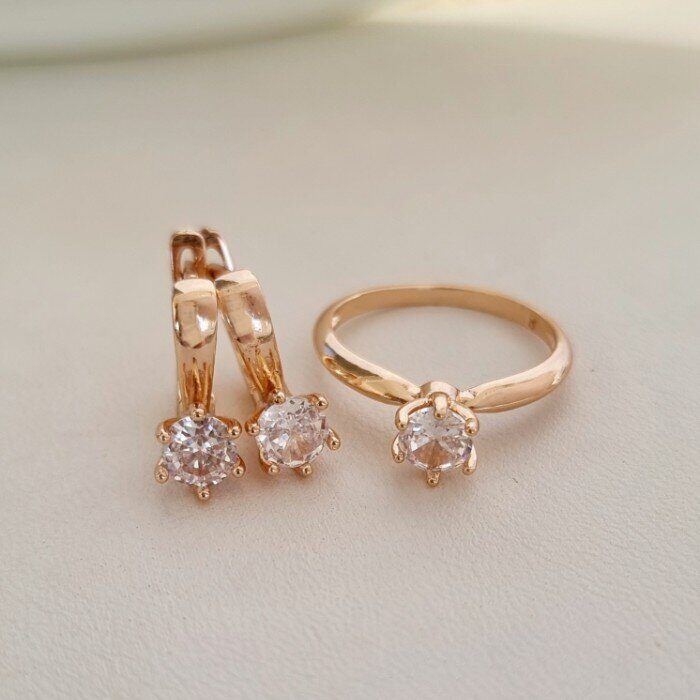 Комплект ювелирной бижутерии, позолота: серьги и кольцо с переливающимся крупным цирконом, р-р 18,5, арт.213.018-18,5