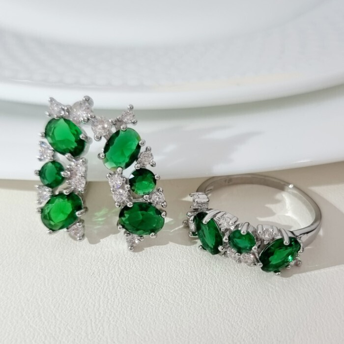 Комплект ювелирной бижутерии, серьги и кольцо 17 р, покрытие посеребрение, вставка: фианиты, цвет: зеленый, Уценка, арт.08.2584