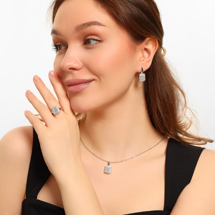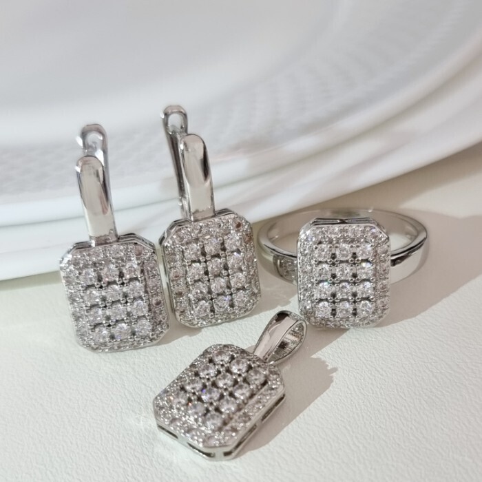Комплект ювелирной бижутерии, серьги, кулон и кольцо 18 р, покрытие посеребрение, вставка: фианиты, цвет: прозрачный, Уценка, арт.08.2594