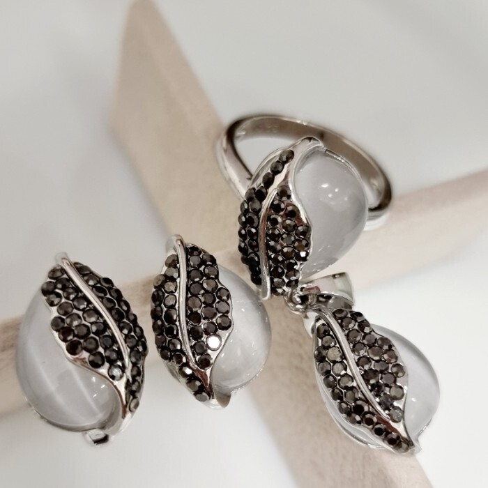 Комплект ювелирной бижутерии серьги, кулон и кольцо 18 р, покрытие: посеребрение, вставка: фианиты и камень кошачий глаз, Уценка, арт.08.2096