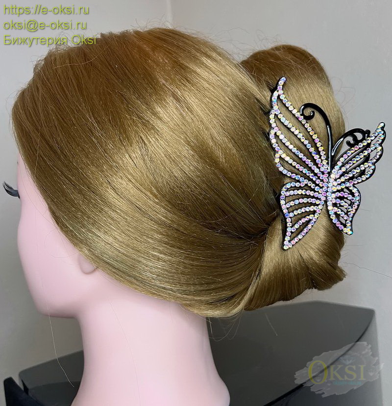 Стильная заколка '' Бабочка '' из качественного каучука чёрного цвета, украшена сверкающими зеркальными или перламутровыми кристаллами ( на фото представлены не все имеющиеся в наличии расцветки). Размер 10,5 см х 6 см. Производство Корея.