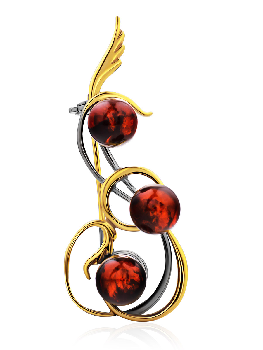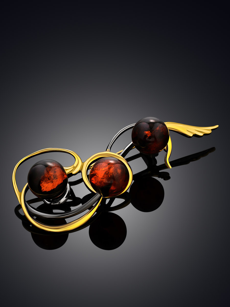 Красивая ажурная брошь, украшенная тёмно-коньячным янтарём «Полонез»