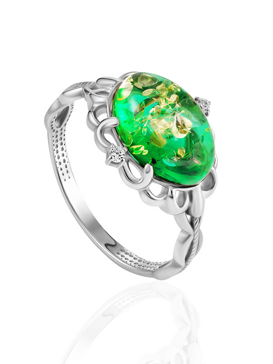 Красивое ажурное кольцо «Луксор» с ярко-зелёным янтарём