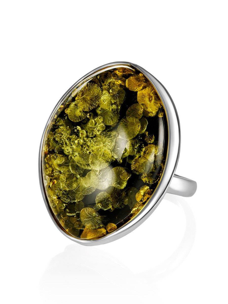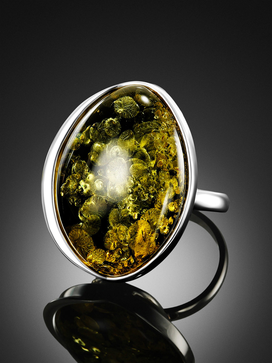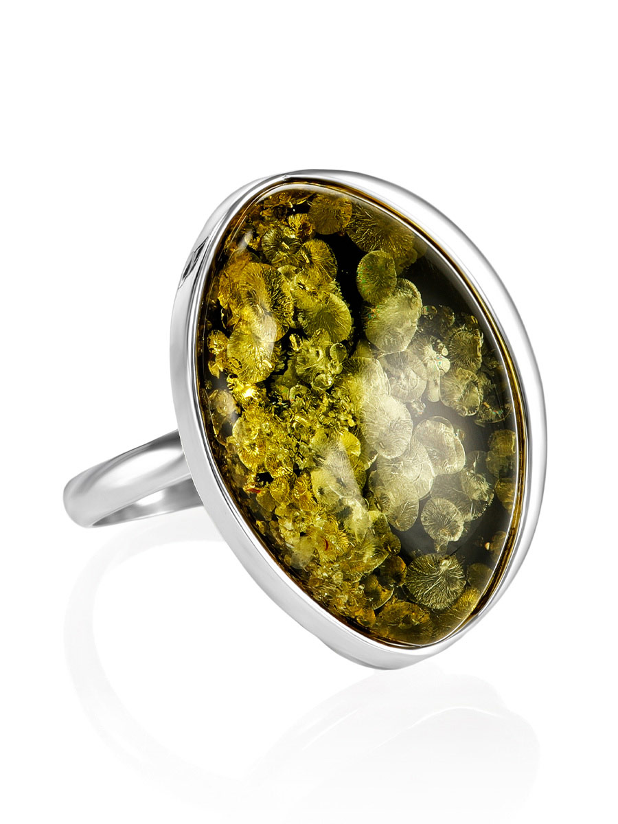 Красивое кольцо из натурального искрящегося янтаря зеленого цвета в изящном обрамлении «Лагуна»