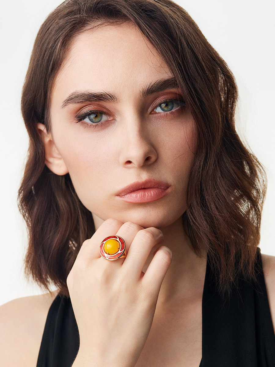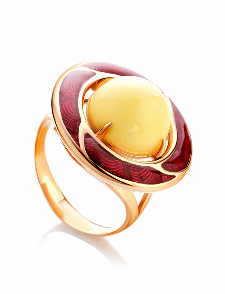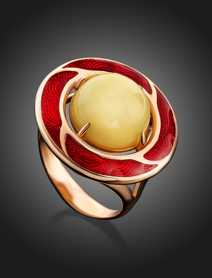 Красивое кольцо с красной эмалью и натуральным янтарём «Ампир»