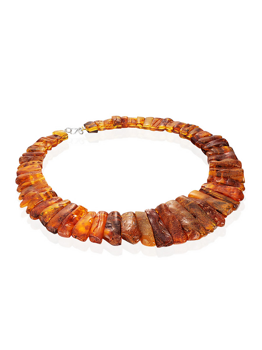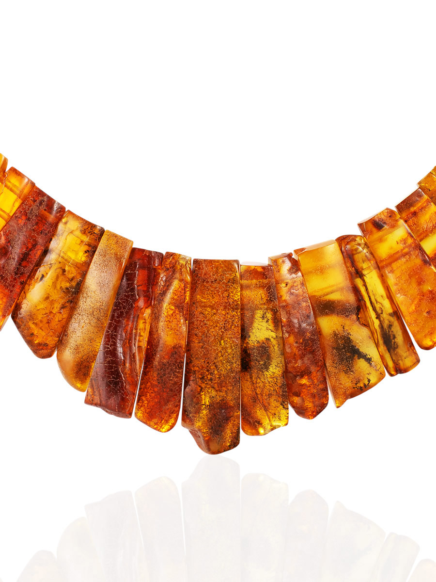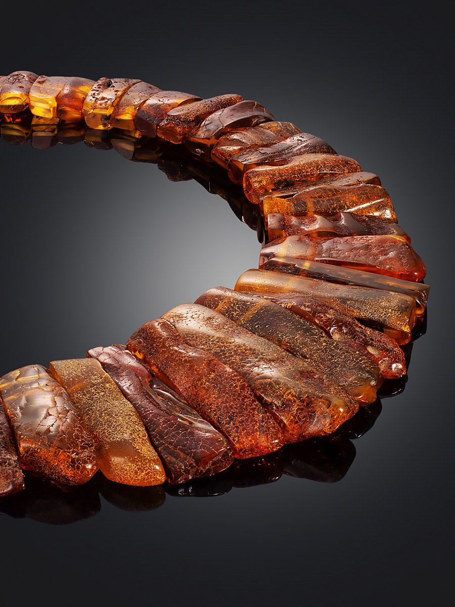 Натуральный балтийский янтарь обладает множеством полезных качеств — издавна известны его лечебные свойства (подробнее о лечебных свойствах янтаря), а также способность положительно воздействовать на эмоциональное состояние и настроение человека. Роскошное колье из нашей коллекции «Помпеи» в полной мере соответствует всем ожиданиям, которые можно предъявить изделию из натурального балтийского янтаря. Крупные пластинки из текстурного янтаря природной формы подверглись минимальной обработке, благодаря чему они не только сохранили все свои полезные свойства, но и эффектный вид. Такое колье отлично впишется не только в этнические или кантри образы, но и подойдёт к вечернему платью с открытыми плечами. _x000D_